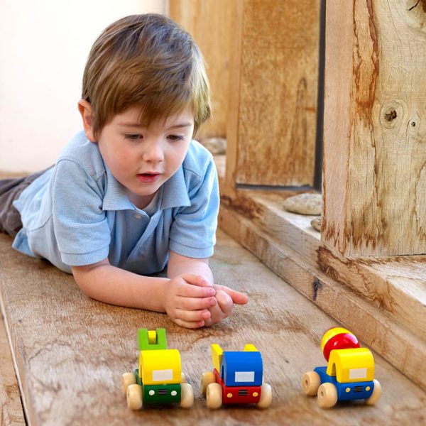 A delightful set of three traditional wooden toy trucks – a pick up truck, a cement mixer and a dumper truck. They are all very brightly coloured in red, blue, yellow and green and are ideal for little hands to grasp and hold.
