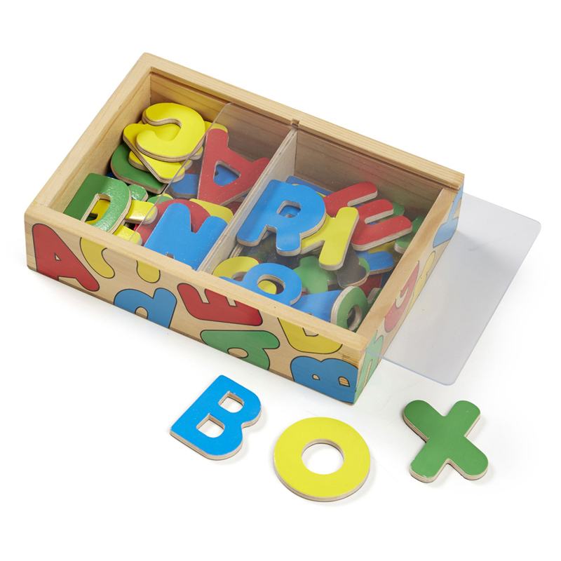 These 52 magnetic uppercase and lowercase letters make a colorful jumble of learning possibilities. The magnets store conveniently in their handy wooden case. Ideal for letter recognition, matching, and stenciling, these must-have letters spell “learning fun”!