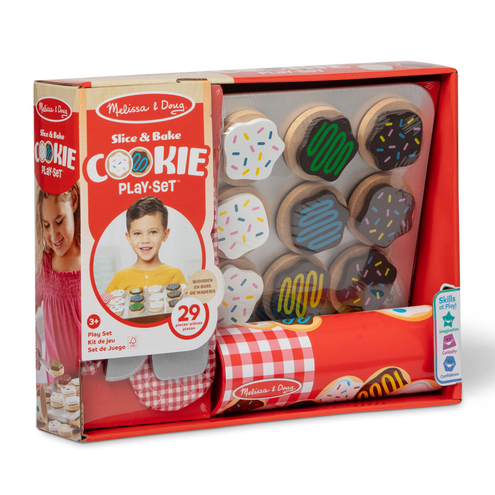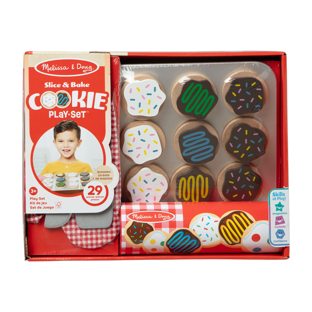 • Colorful wooden play food set includes 12 sliceable cookies, 12 toppings, knife, spatula, cookie sheet, and kitchen mitt