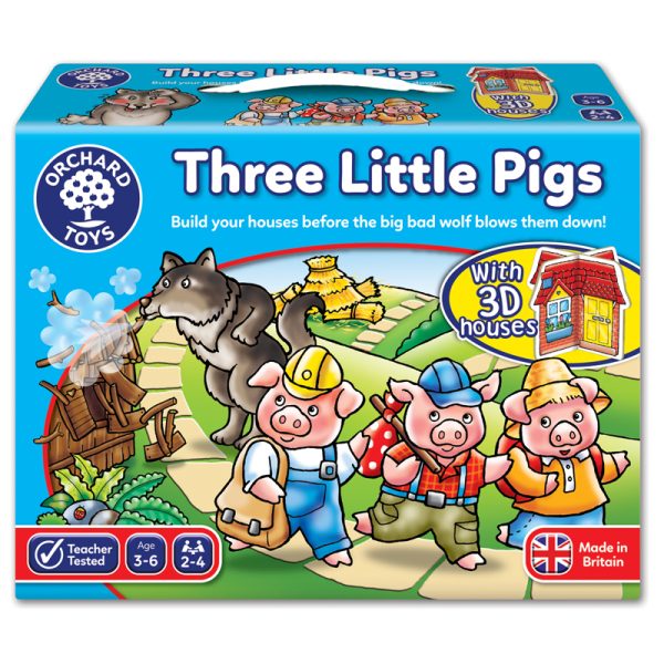 Most people know the story of the three little pigs, all trying to build their houses before the big bad wolf huffs, puffs and blows their houses down! In this simple board game, players must travel around the board collecting and assembling their 3D wood, straw and brick houses. But watch out! If a player lands on the wolf square they must spin the spinner, giving the wolf the chance to huff and puff and blow down their houses.